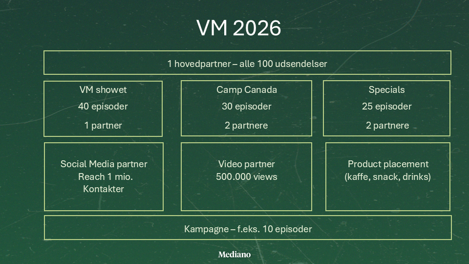 Skriv til kontakt@mediano.nu, hvis du vil høre mere eller ønsker at få et besøg af os. Vores VM-partner starter på 100.000 kroner.